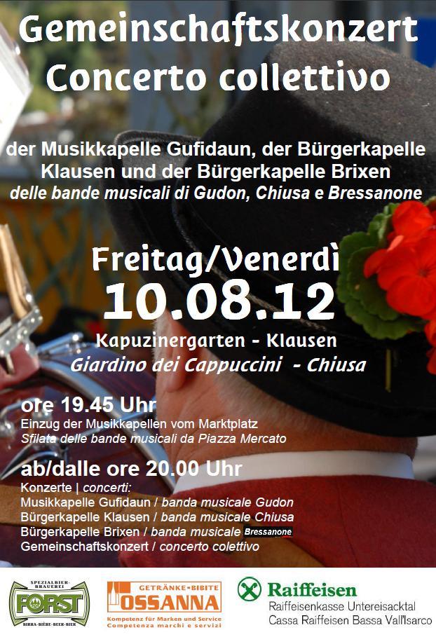 TermineFür Details --> ProbenplanJahresprogramm 2012Jänner 05. Donnerstag: Generalversammlung Februar 18. Samstag: Faschinxfete 26. Sonntag: Andreas-Hofer-Feier März 25. Sonntag: Firmung April 07. Samstag: Ostermarkt ![]() 08. Sonntag: Osterkonzert im Kapuzinergarten von Klausen 15. Sonntag: Erstkommunion Mai 06. Sonntag: Floriani-Feier 19./20. Samstag/Sonntag: Bezirksmusikfest in Klausen (Flyer und Broschüre) ![]() Juni 02./03. Samstag/Sonntag: "Lange Nacht der Blasmusik" in Landeck ![]() 10. Sonntag: Fronleichnam-Prozession 17. Sonntag: Herz-Jesu-Prozession Juli 20. Freitag: Sommerkonzert in Klausen 28. Samstag: Umzug bei Ramba Zamba in Klausen August 10. Freitag: Gemeinschaftskonzert mit MK Gufidaun und BK Brixen in Klausen 17. Freitag: Sommerkonzert in Klausen 24. Freitag: Sommerkonzert in Klausen September 22. Samstag: Gassltörggelen mit Teilnahme am Umzug in Klausen (Musikprogramm) ![]() 29. Samstag: Gassltörggelen in Klausen (Musikprogramm) Oktober 06. Samstag: Gassltörggelen in Klausen (Musikprogramm) November 01. Donnerstag: Allerheiligen 04. Sonntag: Bläser: Heldengedenken 17. Samstag: Cäcilienkonzert in Klausen 25. Sonntag: Cäciliensonntag Dezember 24. Montag: Bläser: stille Nacht, heilige Nacht 29. Samstag: Silvestersammlung - kleine Gruppen 31. Montag: Silvestersammlung voriges Jahr 2011 2011 nächstes Jahr 2013 2013 |