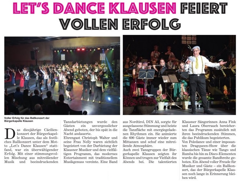Artikel in der Dolomiten vom 12.11.2024 zum Ballkonzert Let’s Dance