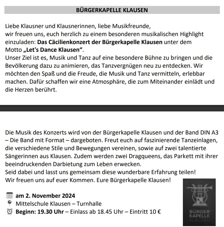 Ankündigung „Let“s Dance Klausen 2024″ im Klausner Bote vom 26.10.2024